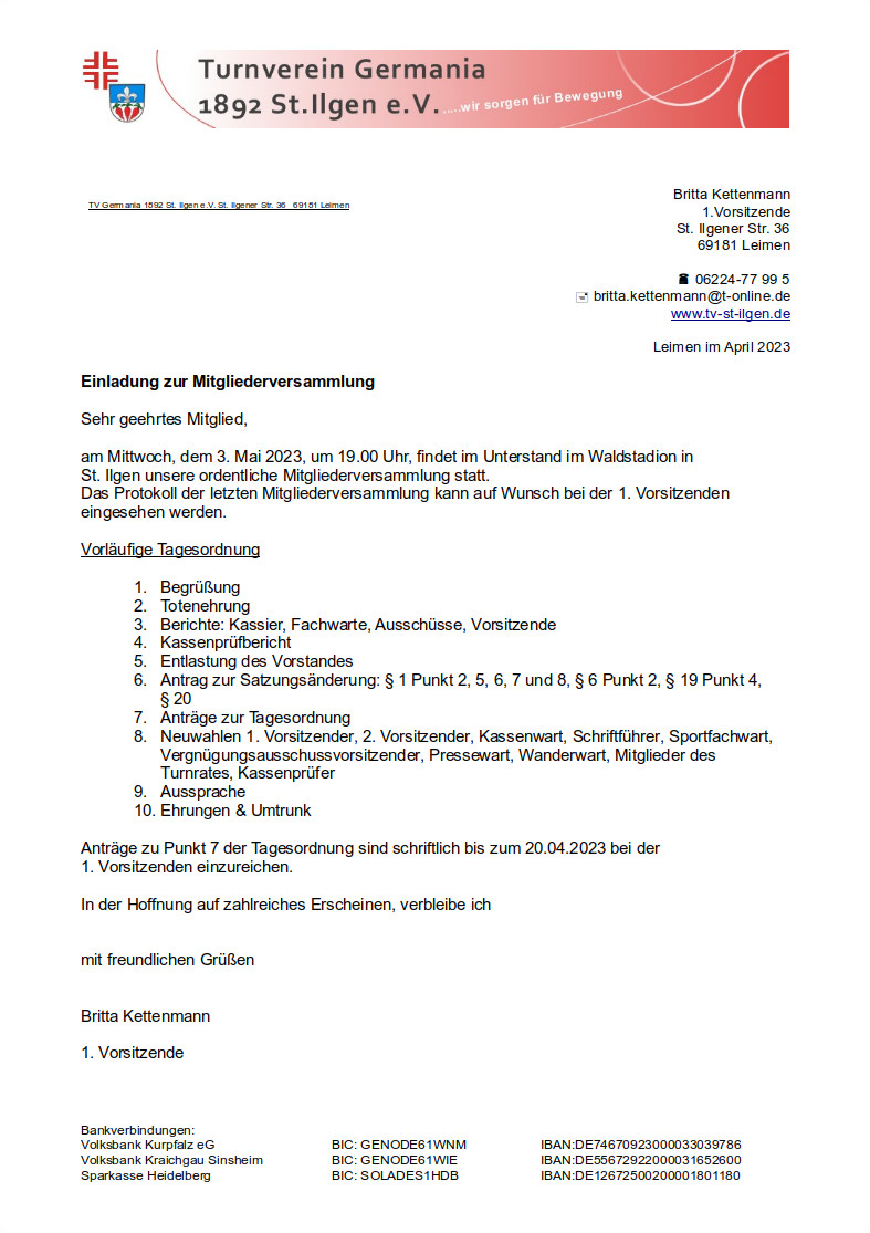 Am Mittwoch, dem 3. Mai 2023, um 19.00 Uhr, findet im Unterstand im Waldstadion in St. Ilgen unsere ordentliche Mitgliederversammlung statt.