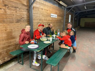 Am Donnerstag, den 14. September, fand sich die Laufgruppe schon um 18 Uhr im Waldstadion ein, um bis 19 Uhr zu trainieren. Von Günther wurden in der Zwischenzeit die Garnituren aufgestellt und der Grill vorbereitet. Bis auf Sandra und Thomas waren alle Teilnehmer einschließlich Ehefrauen mit Kindern erschienen.