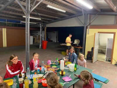Als die ersten Steaks, Würstchen usw. auf dem Grill landeten und anfingen zu brutzeln, wurden die Tische mit tollen Salaten und Baquette beladen. Frank und Günther hatten noch vor dem Essen verschiedene Luftballons aufgeblasen, womit sich die Kinder dann mit Freude beschäftigten. Nach dem leckeren Essen bei guten Gesprächen gab es noch verschiedene Nachspeisen. Dank an unsere Frauen, die so tolle Salate und Nachtische zauberten. Auch gilt der Dank unserem „Grillmeister“ Jan, der alles auf den Punkt grillte.