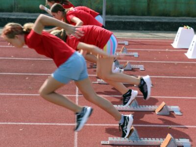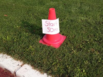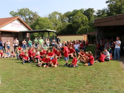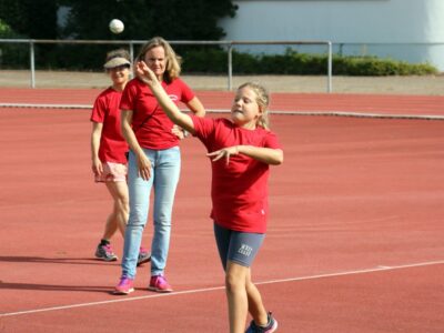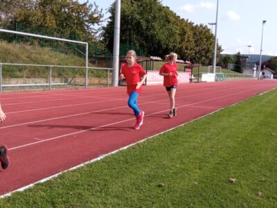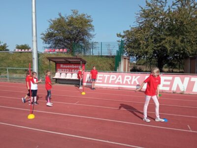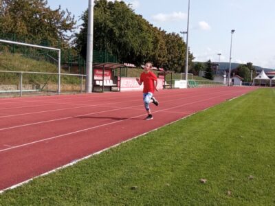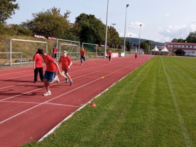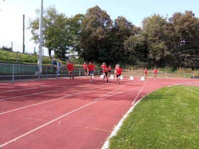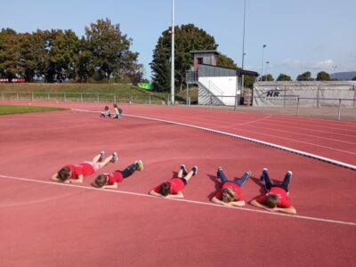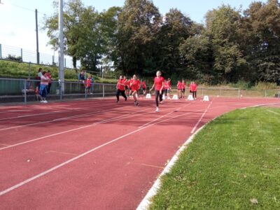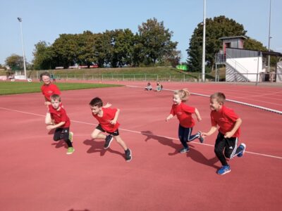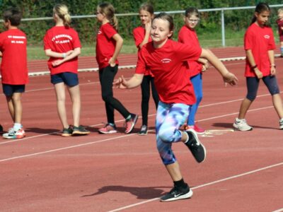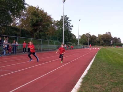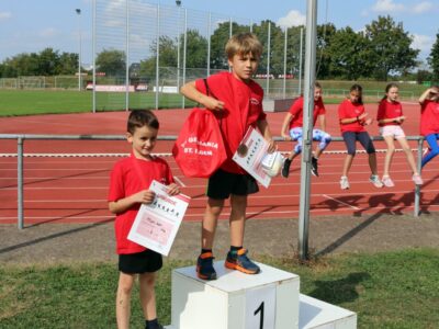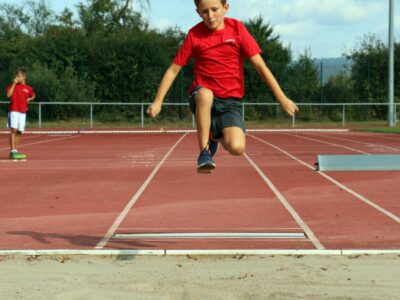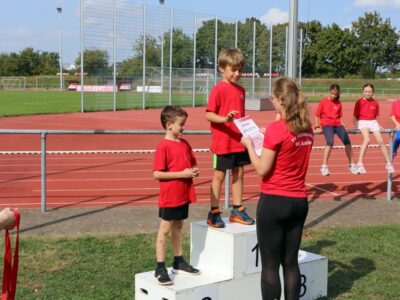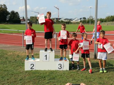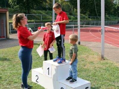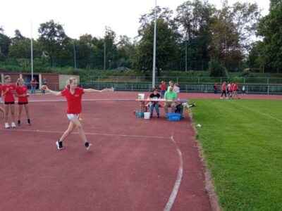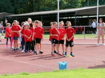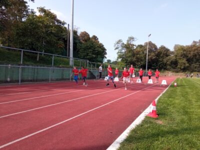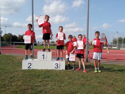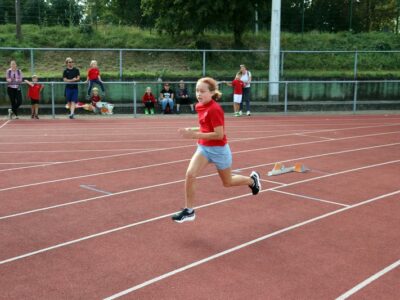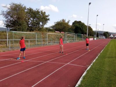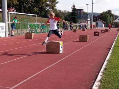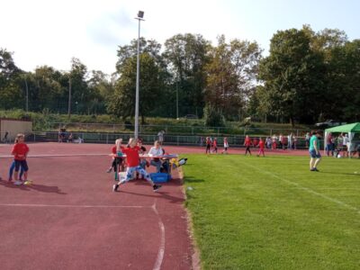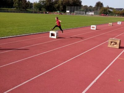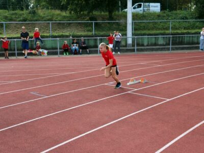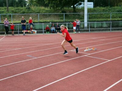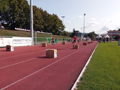 Nachdem alle Kinder, Jugendlichen und Erwachsenen aufgewärmt waren, ging es endlich los! Unsere Kleinsten StarterInnen (U8) absolvierten die Disziplinen Weitwurf, Sprint und Weitsprung. Dabei waren die Wettkämpfe kindgerecht gestaltet, zum Beispiel starteten die Kinder beim Sprint in der Bauchlage und liefen 30m. Die Kinder hatten mehrere Versuche und die erreichte Bestzeit ging in die Wertung ein. In der Altersklasse der U10 musste zusätzlich zum 40m Sprint aus dem Hochstart, dem Ballweitwurf (80g) und dem Weitsprung noch eine Hindernisstaffel gelaufen werden. Hierfür wurden die Kinder in Mixed-Staffeln eingeteilt. Nun hatten die Staffeln drei Minuten Zeit die abgesteckte Strecke mit den fünf Hindernissen (Bananenkisten) möglichst häufig und im Pendelstaffelprinzip zu absolvieren.