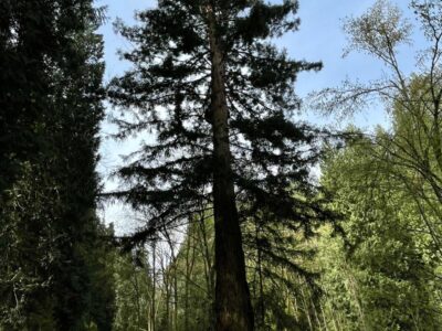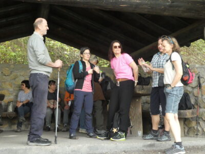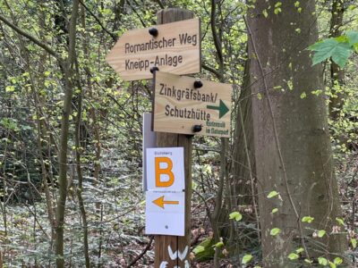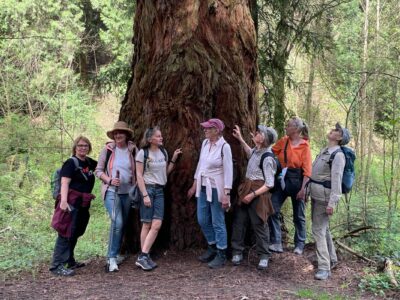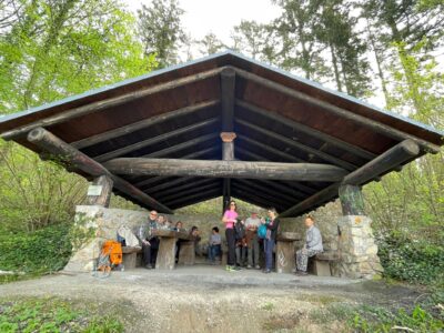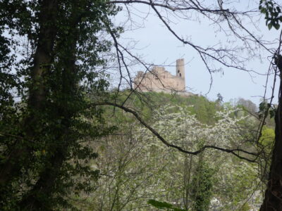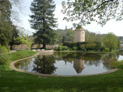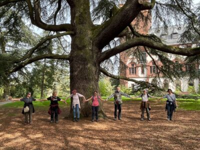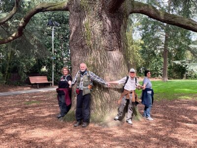 Immer wieder beeindruckend war der Blick in die Rhein-Ebene auf die vielen blühenden Obstbäume und die gelben Rapsteppiche bis hin zu den Pfälzer Bergen. Die historische Zinkgräfbank bzw. die gleichnamige Schutzhütte bot allen Platz für eine erste Rast. Weiter ging es auf breiten Wegen durch den Exotenwald mit zahlreichen fremdländischen Baumarten wie Mammutbäumen, chilenischen Andentannen oder japanischen Magnolienbäumen hinunter zur Kneipp-Anlage und weiter zum Weinheimer Schlosspark. Auf diesem Wegstück hatten wir einen herrlichen Blick auf die Wachenburg und die Burgruine Windeck. Von der im englischen Gartenstil angelegten Parkanlage konnten sich einige nur schwer trennen. Die größte Libanonzeder Deutschlands faszinierte mit ca. 22 m Höhe und 27 m Kronenweite.