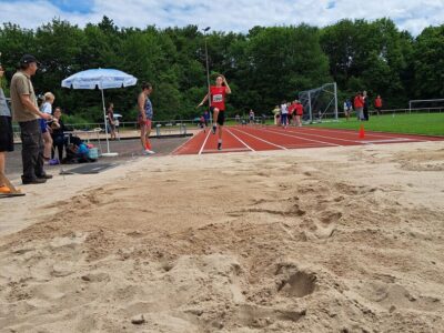 Parallel startete auch sein Bruder Elias (MU18) mit dem 100m-Sprint in seinen Wettkampf. Mit der besten Reaktionszeit war er als erster aus dem Startblock und führte etwa die Hälfte der Strecke seinen Lauf an. Auch wenn das Stehvermögen nicht bis zum Ziel reichte und er letztendlich als vierter in seinem Lauf die Ziellinie überquerte, sicherte er sich mit einer Zeit von 12,88sec eine neue Bestleistung. Weiter ging es anschließend auch für Elias mit dem Weitsprung. Hier war sein Ziel endlich die 5m-Marke zu knacken. In einem sehr guten ersten Versuch reichte es jedoch aufgrund einer schlechten Landung – in welcher er nicht parallel aufkam und sehr viele Zentimeter verschenkte – nur zu 4,80m. Dennoch bedeutete das ebenfalls eine neue Bestleistung.