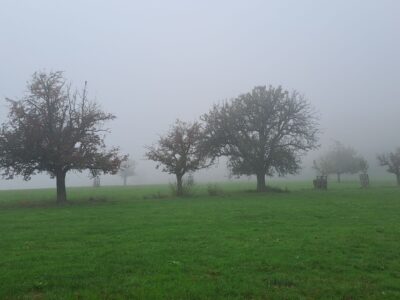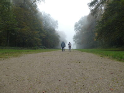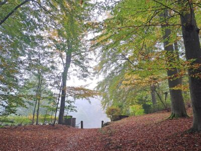 Anschließend führte uns ein bequemer Waldweg zum Ehrenfriedhof. Auf den schönen Blick in Rheinebene mussten wir leider verzichten, da sich der Nebel nicht auflösen wollte. Allerdings zauberten die hellen Nebelschwaden zwischen den buntbelaubten, hohen Bäumen eine ganz besondere Stimmung. An der Waldparkhütte beim Max-Planck-Institut für Kernphysik gönnten wir uns eine längere Pause. Gut, dass die mitgebrachten Behältnisse geleert wurden, denn zu unserer Überraschung war der weitere Weg Richtung Boxberg, der „Neuersteinbruchschlagweg“, mit Esskastanienbäumen gesäumt, sodass fleissig Maronen gesammelt wurden. Als das Weingut Bauer bereits in Sicht war, bogen wir zur Endhaltstelle am Emmertsgrund ab und die Gruppe beschloss spontan dort in den wartenden Bus einzusteigen. So kehrten wir nach vier Stunden nach Leimen zurück und hatten die gemeinsame Zeit mit Gesprächen genießen können.