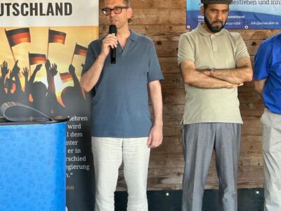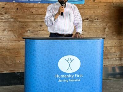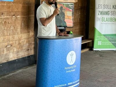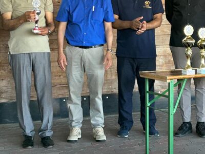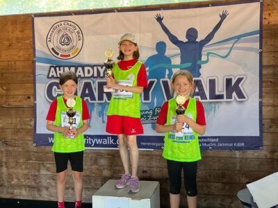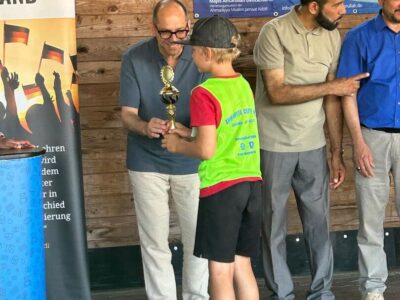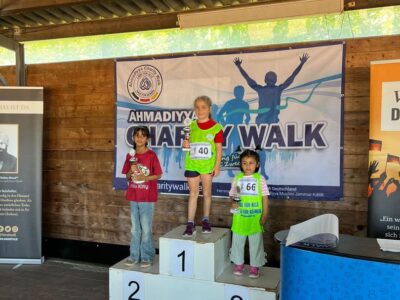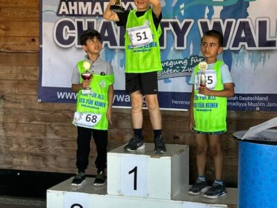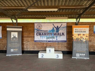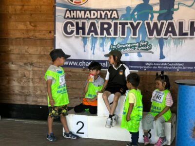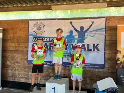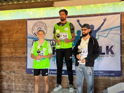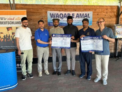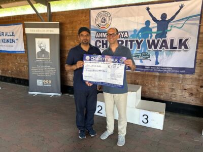 Alle Läufer und Läuferinnen zeigten hervorragende Leistungen – herzlichen Glückwunsch! Im Anschluss an die Pokalverleihung fand auch die Spendenübergabe statt. Sukumar Munshi, zweiter Vorsitz beim TV, nahm das Spendencheck der Ahmadiyya an und bedankte sich für die Spende. Zum Abschluss der gelungenen Wohltätigkeitsveranstaltung gab es für alle ein Mittagessen.