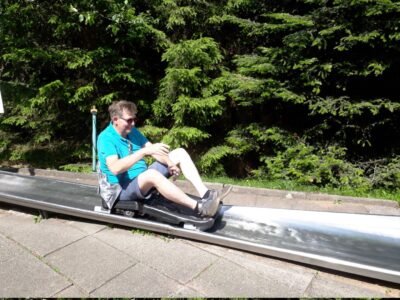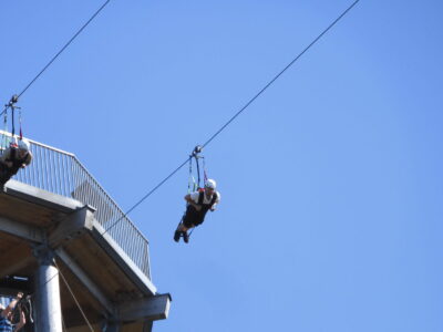 Am nächsten Tag ging es bei herrlichem Wetter mit einer Wanderung zu einer der ältesten Sandsteinbrücke in Deutschland. Nachdem wir sie aufgespürt hatten, im tiefsten Wald, kamen schnell 12 km zusammen. Ferner erfolgte eine Fahrt zum Aussichtsturm Himmelsglück, um von dort am Stahlseil 600 Meter über den Baumwipfeln in die Tiefe zu stürzen, somit Adrenalinkick pur. Doch nur Heinrich, Uwe und Peter wollten sich dieses Abenteuer mit dem Flying Fox nicht entgehen lassen.