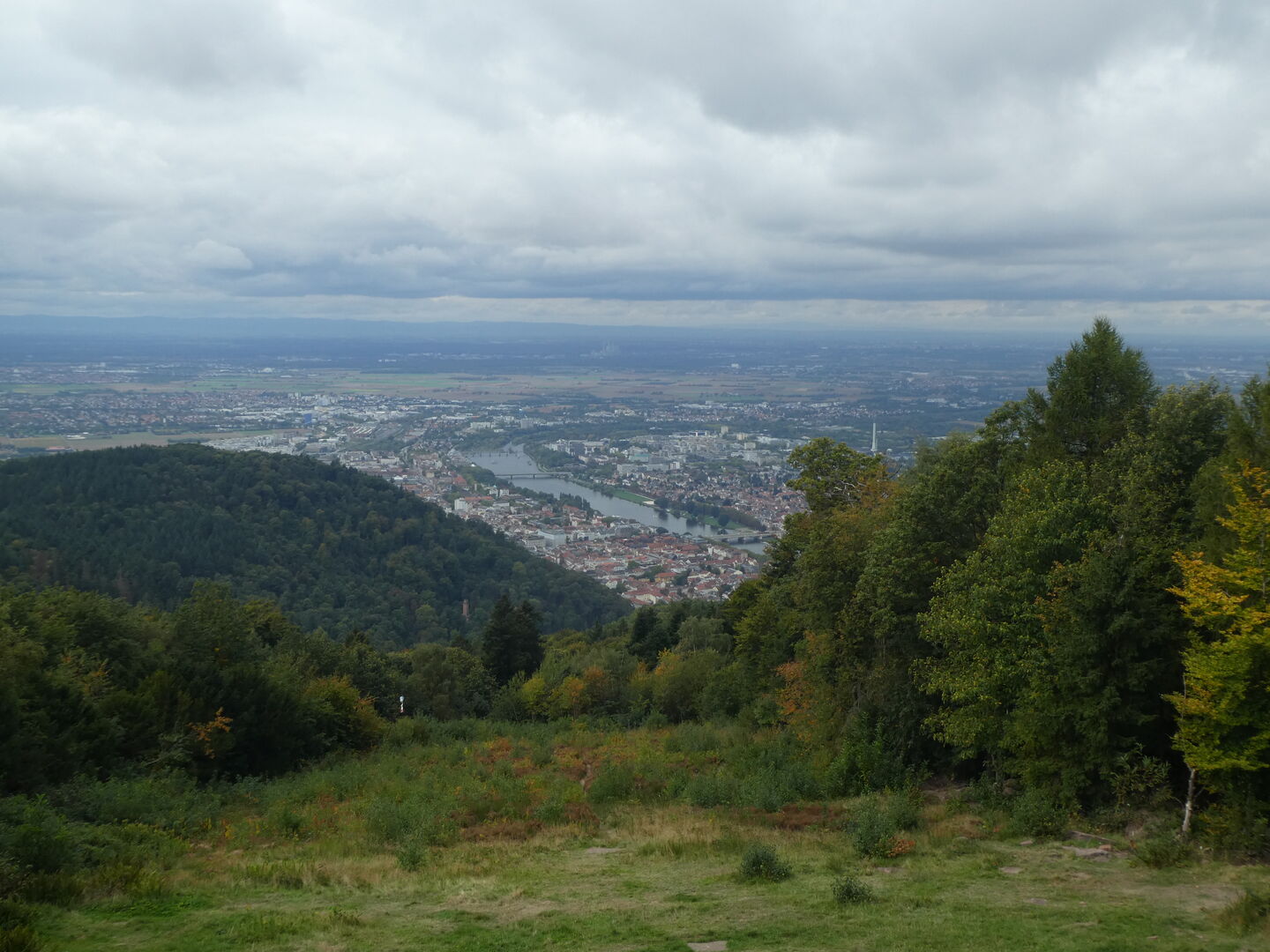 Wir genossen den Blick auf die Rheinebene, über der sich die ersten Regenwolken zusammenzogen. Unverdrossen wanderten wir auf dem Odenwald-Vogesenweg zum Aussichtsturm „Posseltslust“. Dieses Bauwerk war 1881 eingeweiht worden, nachdem der Heidelberger Stadtrat und Pharmazie-Professor Louis Posselt dessen Bau testamentarisch verfügt hatte. Um eine anwesende Hochzeitsgesellschaft nicht bei ihrem Fotoshooting zu stören, verzichteten wir auf eine Turmbesteigung und wanderten auf breiten Waldwegen zum Waldhaus weiter. Diese große Hütte bot viel Platz für eine gemütliche Pause im Trockenen. Leider begann es nach der Pause zu nieseln, Schirme wurden aufgespannt und Regenponchos angezogen. Auf dem Weg bergab schützte uns der dichte Wald vor dem Regen. Oberhalb vom Emmertsgrund wurde es allerdings zunehmend windig, kühl und der Regen stärker. Die 18 Grad fühlten sich deutlich anders an als die 32 Grad am Tag zuvor! Spontan beschloss die Gruppe in den an der Endhaltstelle Emmertsgrund wartenden Bus zu steigen. Nach fünf Stunden in netter Gesellschaft kehrten wir in guter Stimmung nach Leimen zurück.
