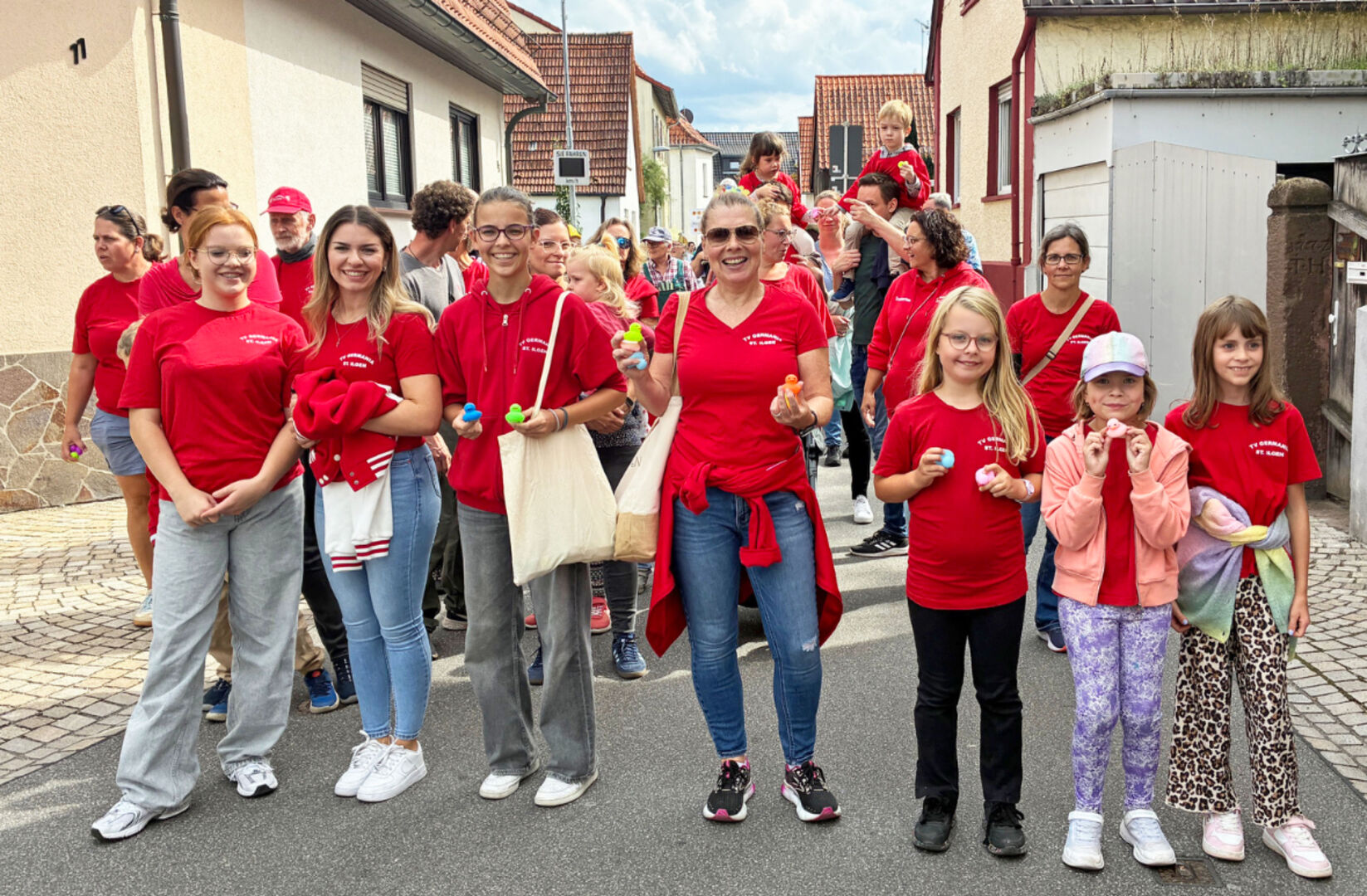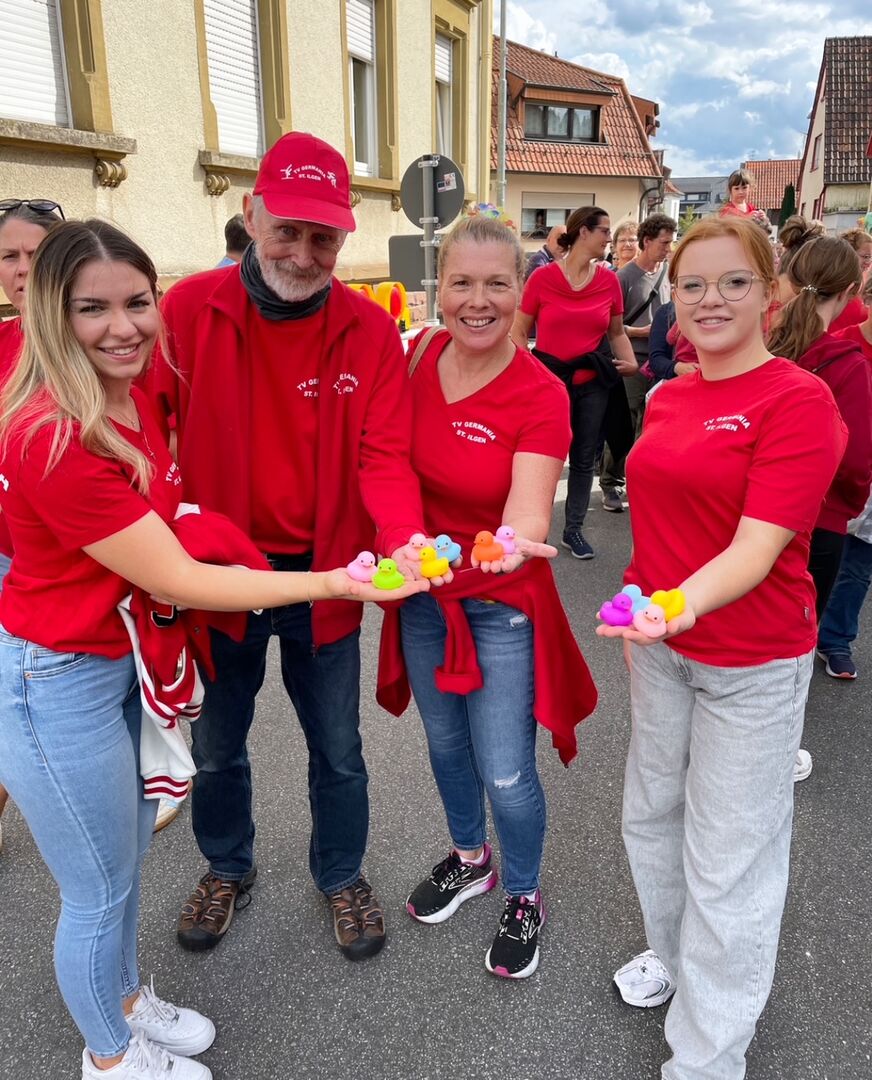 Samstags bei sonnigem Wetter ging ab 14:30 Uhr der Umzug durch die Straßen von St. Ilgen und wir hatten als Motto „Die Welt ist bunt, der TV Germania auch“. Unsere Aktiven, die Turnkinder, die Vorstandschaft, und die Übungsleiter waren alle mit ihren roten Vereins-T-Shirts gekleidet und verteilten über 300 Quietsche-Enten an die vielen Zuschauer & Besucher.