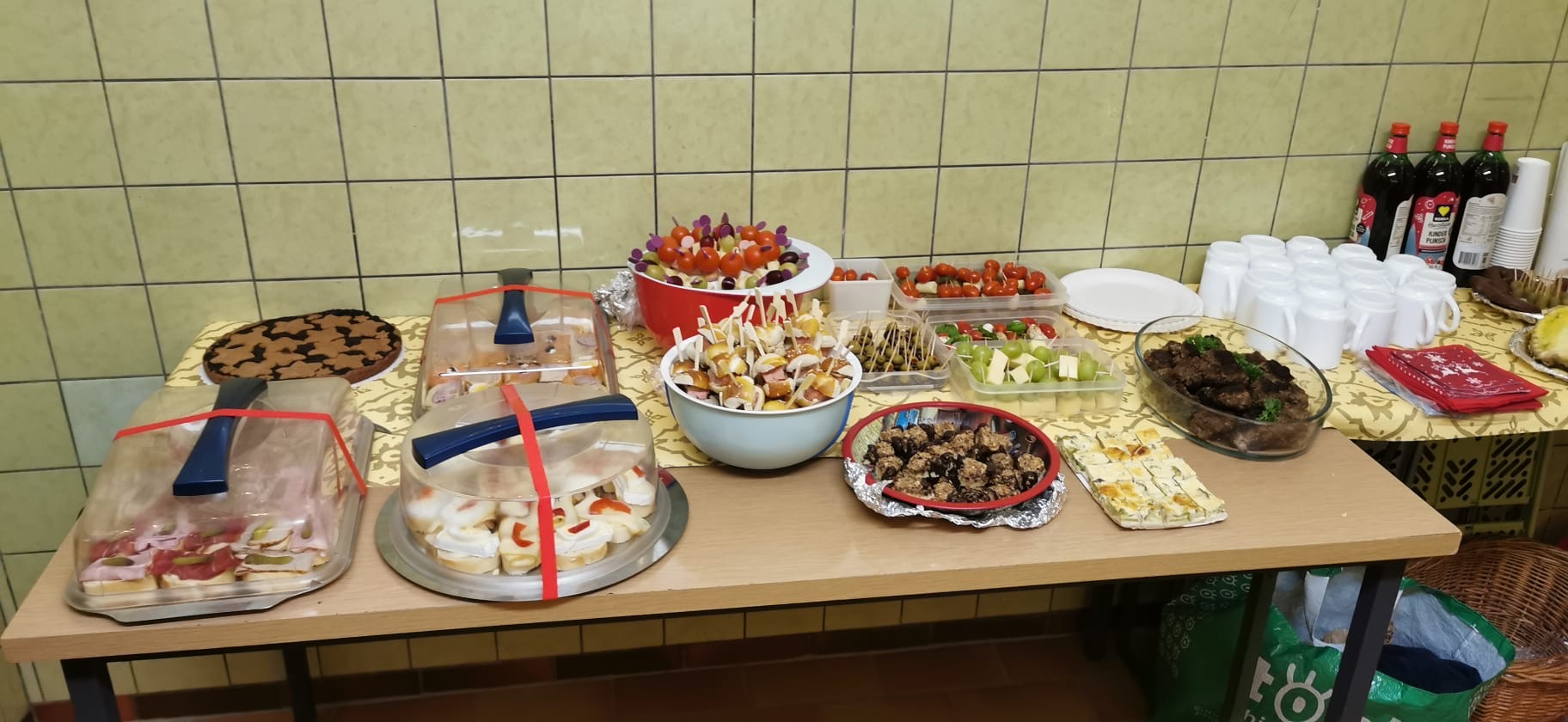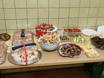 12 Sportler, die regelmäßig im Kraftraum trainieren, brachten jeweils selbstgemachtes Fingerfood mit (3 Sportler konnten leider nicht teilnehmen). Die Vielfalt der Köstlichkeiten reichte von herzhaften Häppchen, sowie Spießchen bis zu Weihnachtsgebäck und Linzerkuchen. Während Glühwein, Punsch und kalte Getränke angeboten wurden, wurde das Essen genossen.