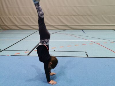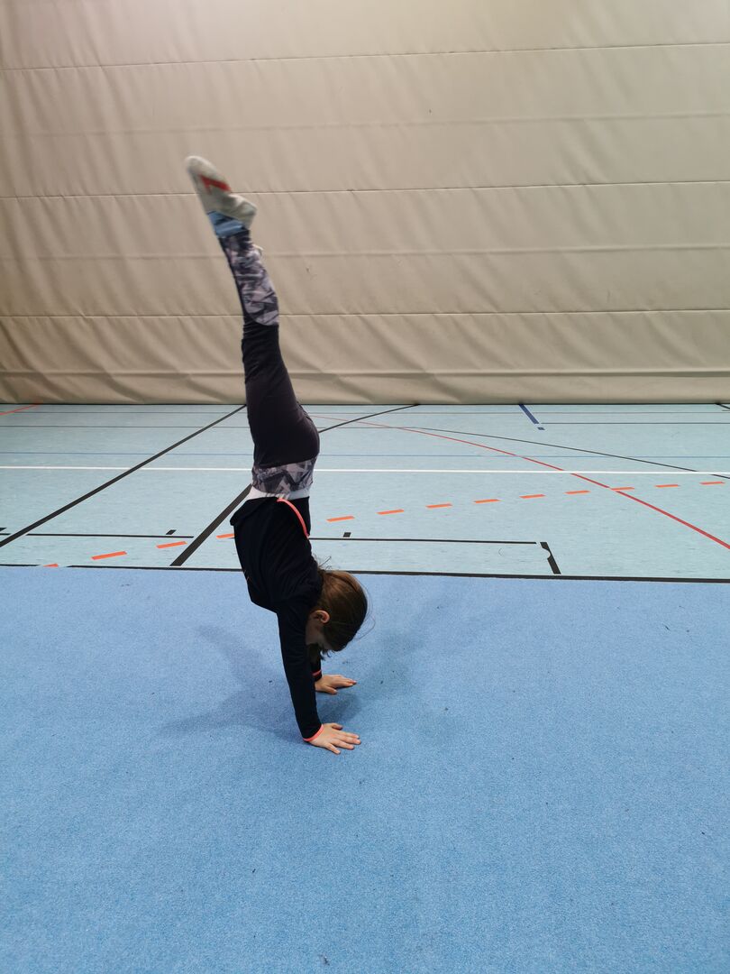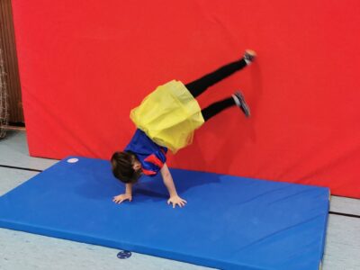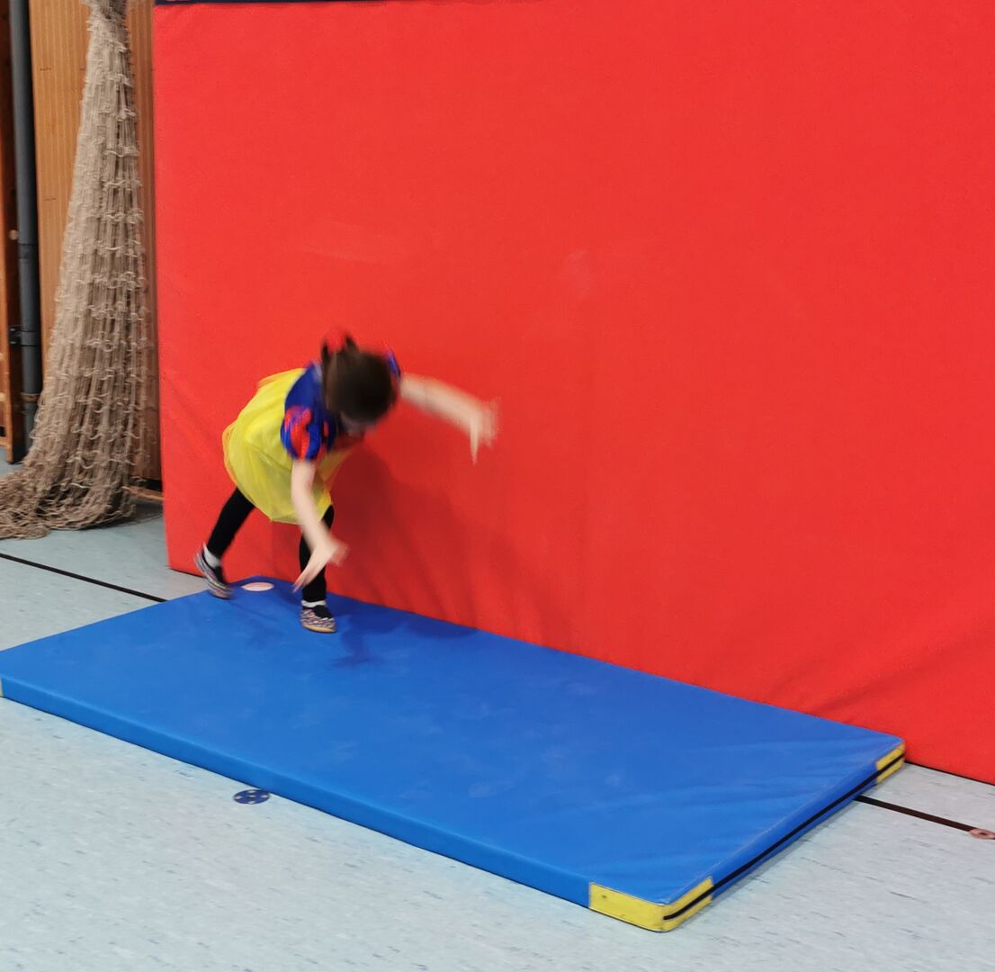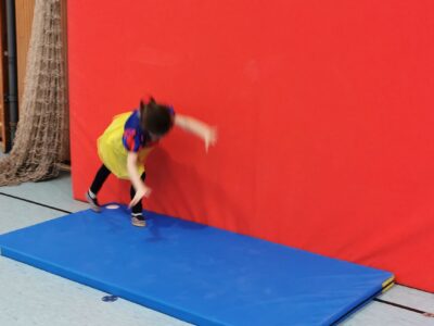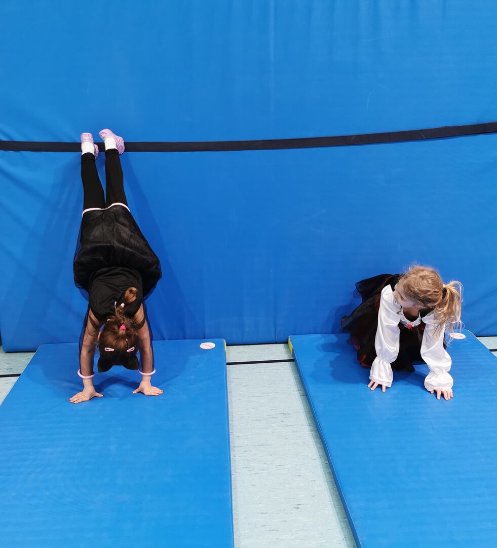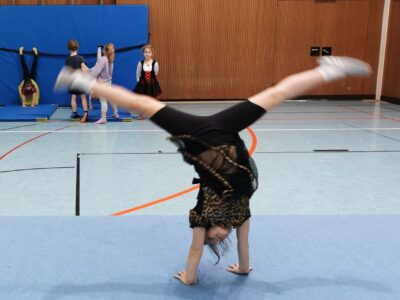 Danach ging es dann ans Turnen. Fleißig wurde der „Handstand“ und das „Rad“ an verschiedenen Stationen geübt. Durch die verschiedenen Vorübungen, die die Kinder auch größtenteils alleine bewältigen konnten, sah man schnell Fortschritte und die Kinder waren stolz auf sich und das was sie geleistet hatten.