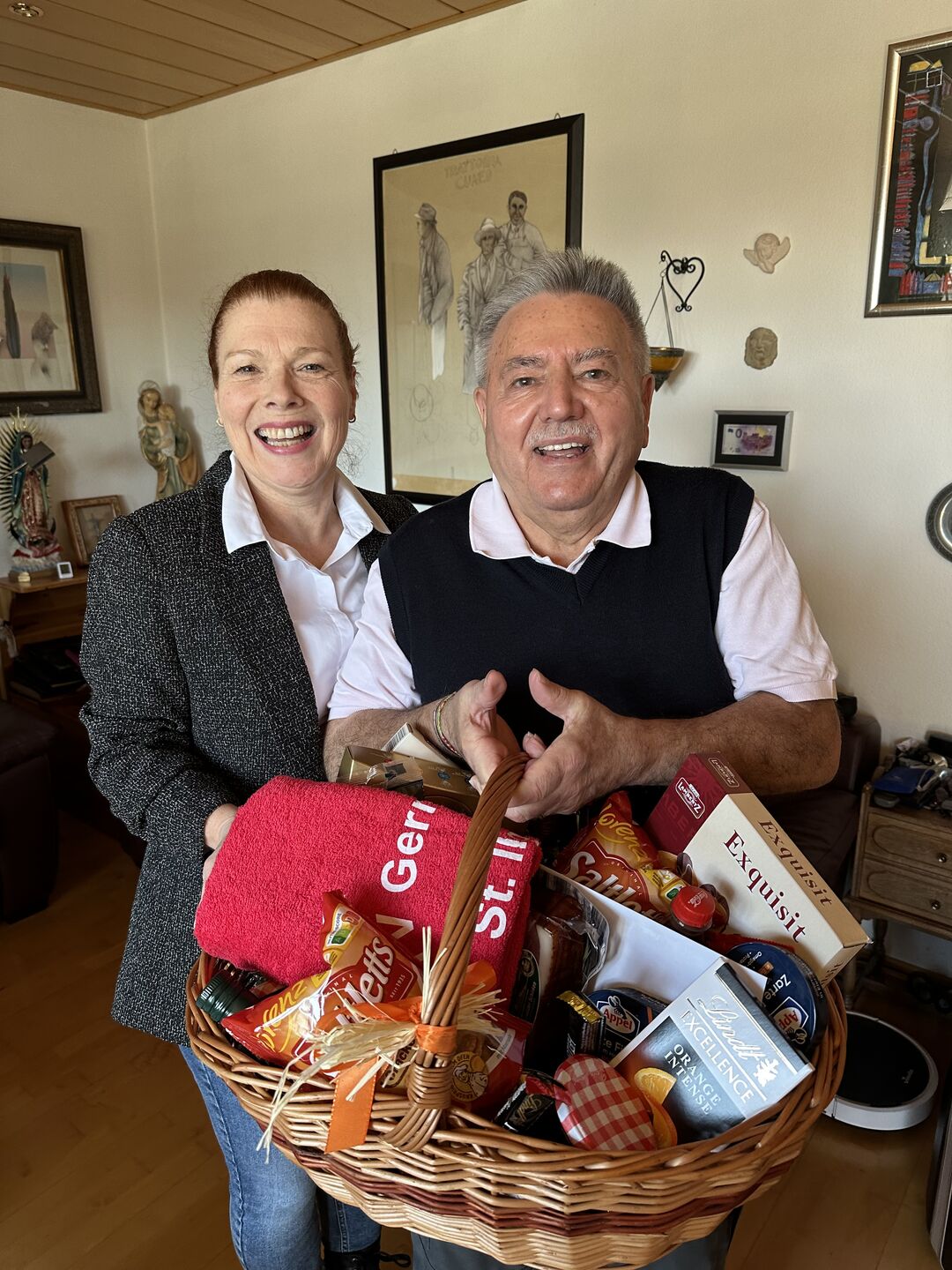 Franz Weber feierte am 29.03.2026 seinen 80. Geburtstag und Britta Kettenmann überbrachte die Glückwünsche und einen Geschenkkorb der gesamten Vorstandschaft.